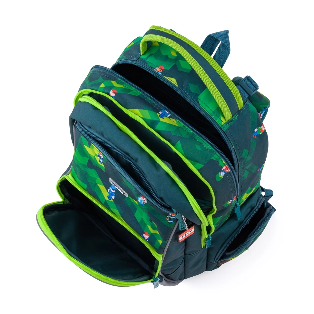 Interiér nabídne dvě prostorné vnitřní kapsy pro učebnice, sešity a věci na volný čas, po stranách pak najdete dvě menší kapsy – jednu otevřenou a druhou na zip. Pevné nepromokavé dno chrání obsah před vlhkostí i ušpiněním a batoh tak zůstává déle jako nový. Díky reflexním prvkům je dítě lépe viditelné za šera i za deště.