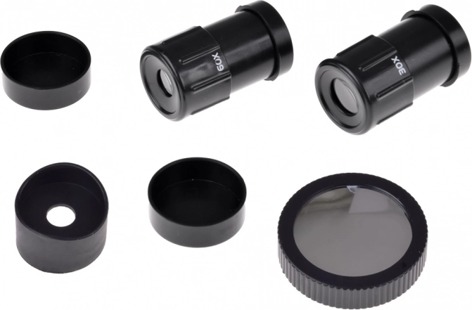 Součástí je vše, co potřebujete: dva okuláry pro rychlou změnu zvětšení 30x/60x, zenitové zrcátko pro pohodlné pozorování, hledáček pro snadné zamíření a držák telefonu pro pořizování snímků a videí. Bezpečnost při denní astronomii zajistí membránový filtr pro sledování Slunce.