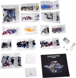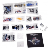 Součástí jsou očíslované sáčky pro snadnou orientaci, USB kabel pro nabíjení a přehledný obrázkový návod. Efektní červené světlo dodává modelu působivý vzhled a zvýrazňuje pohybující se části.