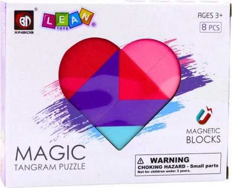 Objevte zábavu s magnetickým tangramem – srdce. Osm pestrých dílků s kvalitními magnety umožňuje skládat desítky různých figur a obrazců. Díky pevné fixaci jsou modely stabilní, snadno se přenášejí a děti si tak mohou dlouho a radostně hrát.