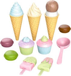 Tato pestrá sada zmrzlin a sladkostí přenese děti do světa lahodných dezertů a zábavného prodávání. Realistické detaily a pastelové barvy lákají k objevování, kombinování příchutí a společnému hraní. Ideální jako samostatná hračka i doplněk dětské kuchyňky či obchůdku.