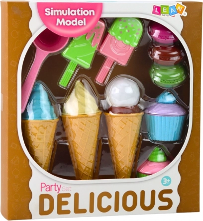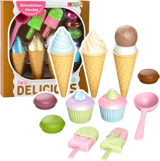 Barevná sada zmrzlin a dezertů potěší všechny malé cukráře. Obsahuje rožky, nanuky, cupcaky, makronky a naběračku – vše z bezpečného plastu. Podporuje kreativitu, jemnou motoriku a hraní rolí v cukrárně či zmrzlinárně.