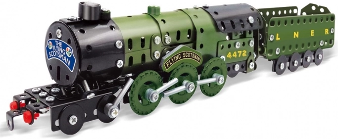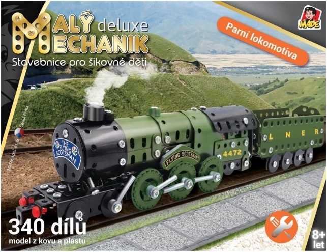 Stavebnice Malý mechanik: parní lokomotiva s uhlákem, 340 dílků. Kovové a plastové části, nářadí i návod v balení. Rozvíjí logiku a motoriku. Věk 8+.