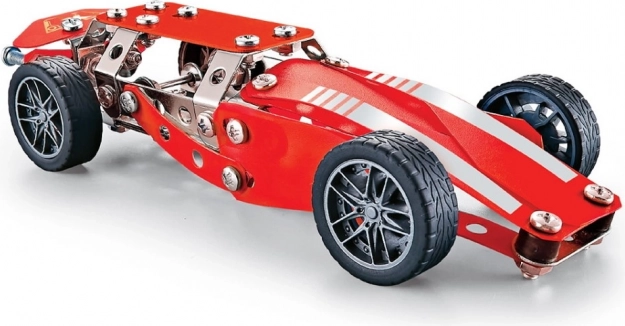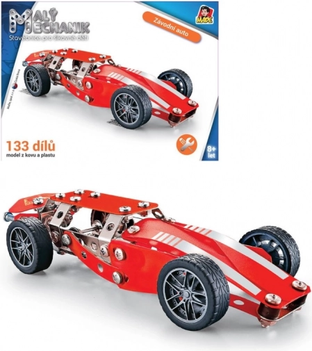Stavebnice Malý mechanik – formule s 133 dílky. Kovové i plastové díly, šroubky a matičky, šroubovák a klíč v balení. Rozvíjí motoriku a kreativitu. 8+.
