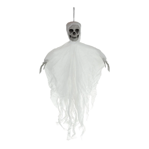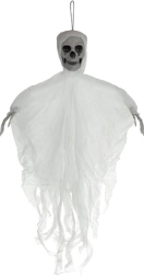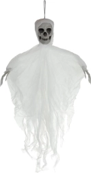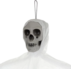 Realistická závěsná kostra s lebkou a potrhanou tkaninou okamžitě navodí strašidelnou atmosféru. Lehká konstrukce a očko pro zavěšení umožňují snadné umístění na strop, dveře či lustr, ale i pod zastřešené venkovní prostory. Pohybující se látka vytváří efekt vznášející se přízraky a větší rozměr 70 cm zajistí, že se stane středem pozornosti. Skvělé pro Halloween, tematické party i scénografii.