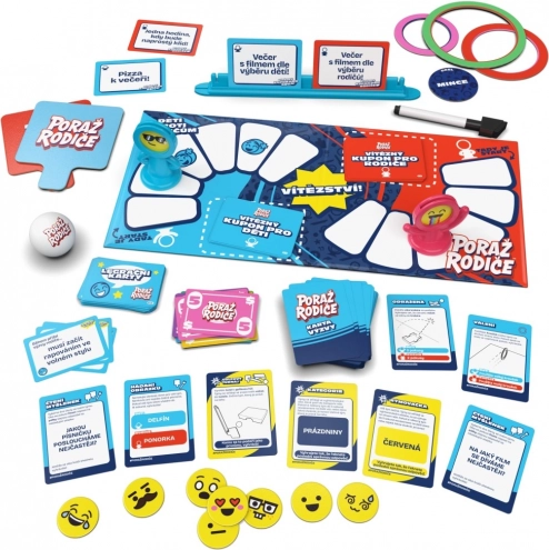 Rodinná hra Poraž rodiče 2025: nové kvízy, aktivní výzvy a 3D překážky z krabice. Zábava pro 4–8 hráčů od 6 let. Skvělá volba na herní večery.