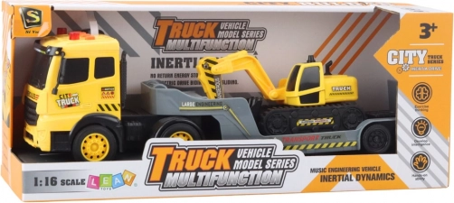 Nákladní auto s podvalníkem a pásovým bagrem 1:16. Friction Power, LED světla a zvuky, otočný bagr 360°, sklopná rampa. Kvalitní plast, ideální dárek.