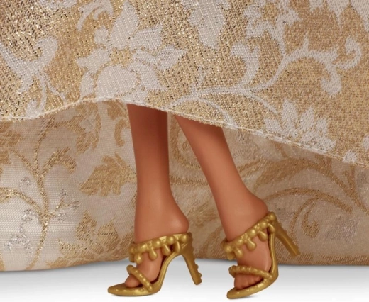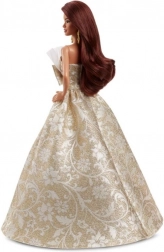 Tato sváteční Barbie okouzlí dlouhými hnědými vlasy, velkolepými náušnicemi a nádhernými šaty inspirovanými plesovou módou. Bohatá sukně se zlatobílým vzorem, tylové detaily a výrazná mašle působí luxusně a vyniknou jak při hře, tak při vystavení na poličce.