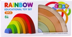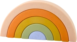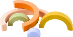 Tato pastelová duhová sada z kvalitní gumy nadchne každé dítě i rodiče. Jednotlivé oblouky v různých velikostech lze skládat, vrstvit i propojovat do nápaditých tvarů. Měkký materiál je příjemný na dotek a šetrný k drobným ručkám, takže je ideální pro první stavění.