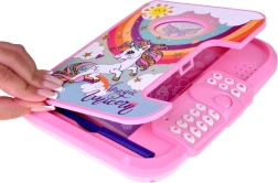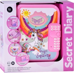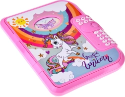 Interaktivní deníček s motivem jednorožce je vysněným místem pro všechny dětské myšlenky, kresby i tajemství. Po zadání správného kódu se deníček otevře a odhalí růžový sešit, psací fix a tajnou schránku na drobné poklady. Přední rámeček si lze přizpůsobit výměnným obrázkem.
