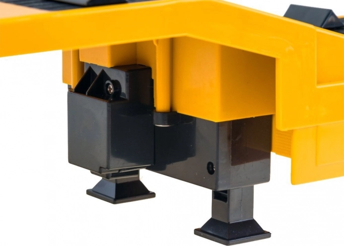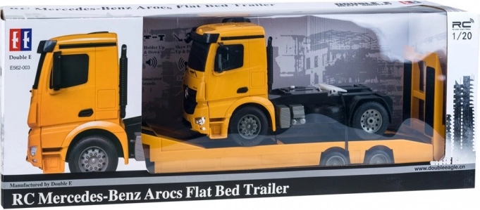 Licencovaný tahač MERCEDES-BENZ s plato návěsem pro převoz stavebních strojů nabízí realistické zvuky motoru, světelné efekty a plné ovládání na frekvenci 2,4 GHz. Díky gumovým pneumatikám a nastavení sbíhavosti kol je jízda plynulá a přesná. Návěs má zvedací rampu i stavitelné podpěry a lze jej elektronicky připojit/odpojit pomocí dálkového ovladače.