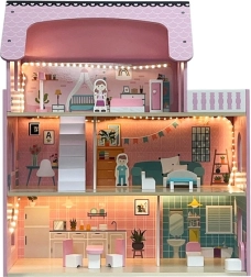 Velký dřevěný domeček pro panenky KRUZZEL s LED osvětlením, 3 patry a 5 pokoji s balkonem potěší každé dítě. Je bezpečný a pevný, vyrobený z hladce broušeného dřeva bez ostrých hran. V balení najdete kompletní sadu nábytku a doplňků, takže zábava může začít hned po sestavení. Teplé bílé světlo vytváří kouzelnou atmosféru i při večerním hraní.