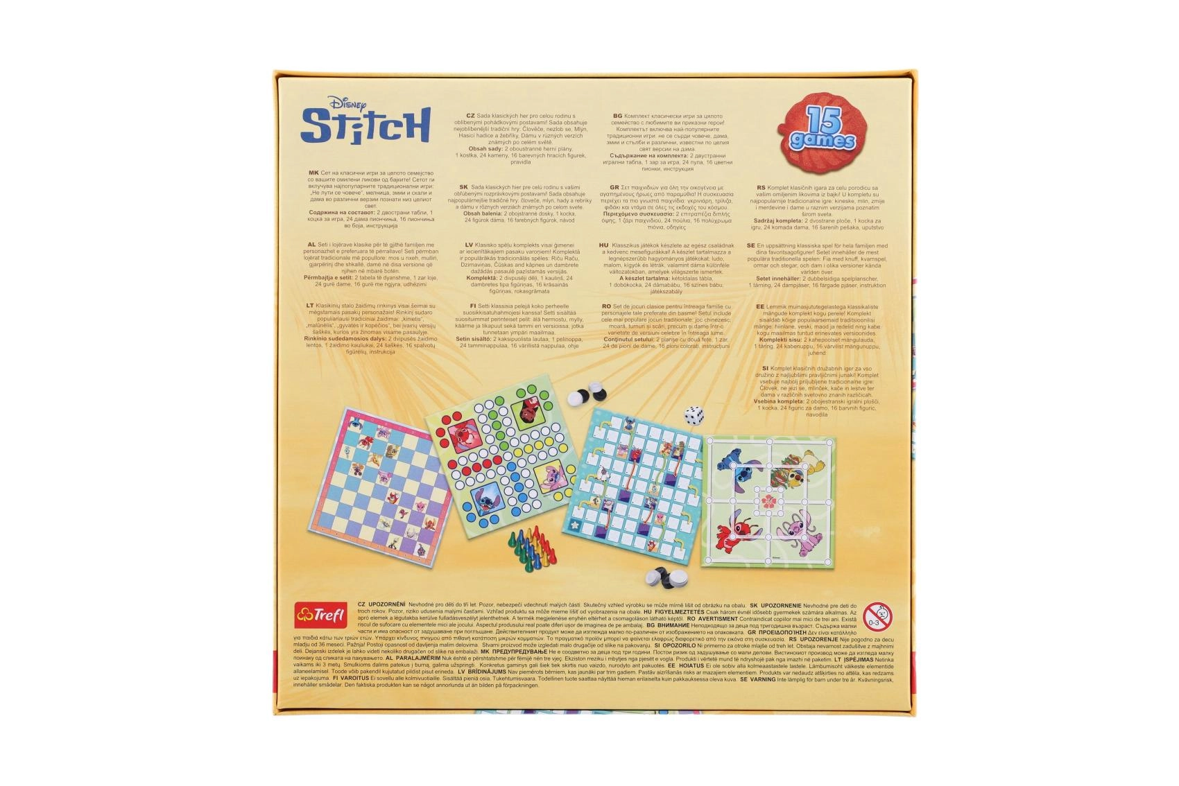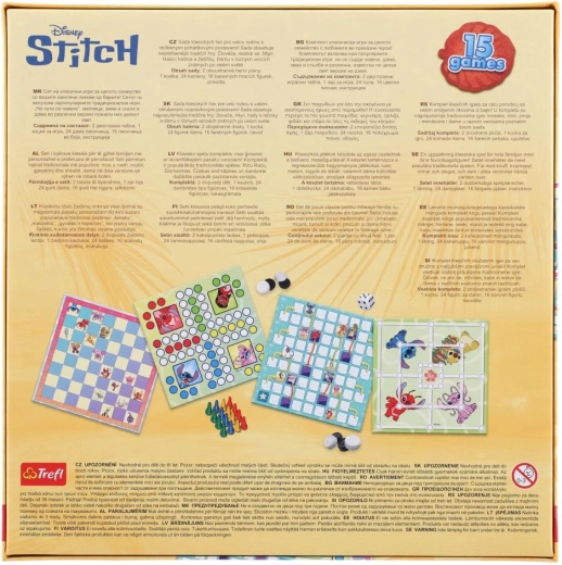 Užijte si společné chvíle se sadou 15 klasických her s motivem STITCH. V jedné krabici najdete oblíbené rodinné hry jako Člověče, Mlýn, Hadi a žebříky a Dáma v různých variantách. Ideální pro rodinné večery, rozvoj logiky a zábavu pro děti i dospělé.