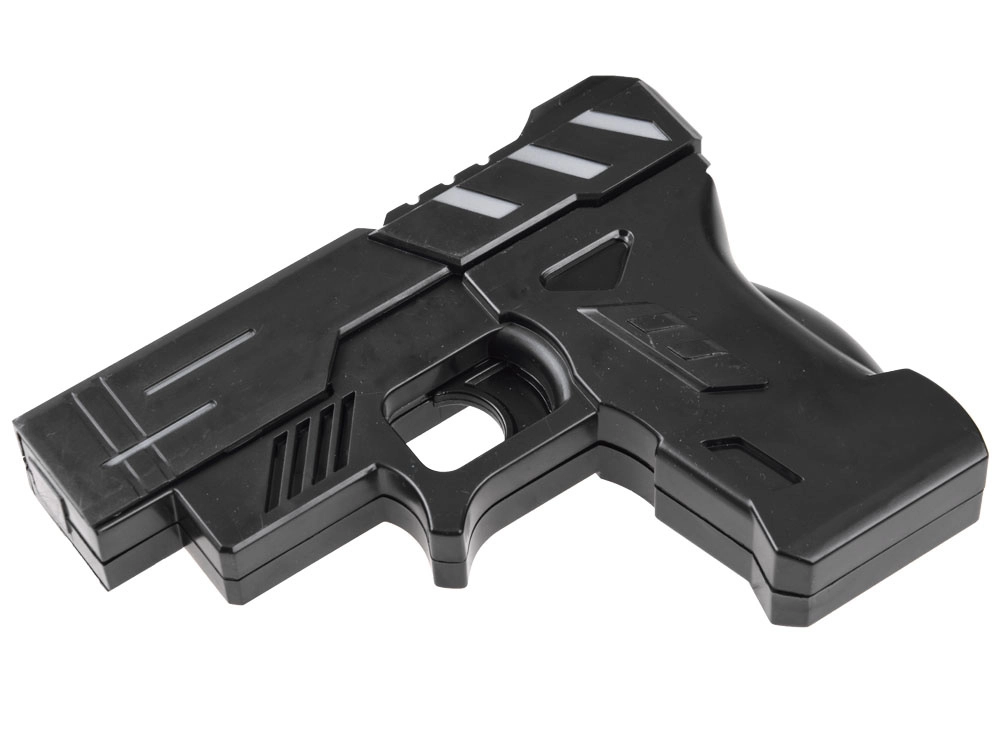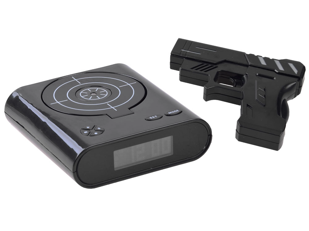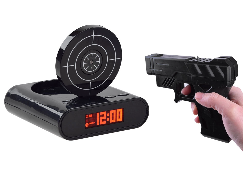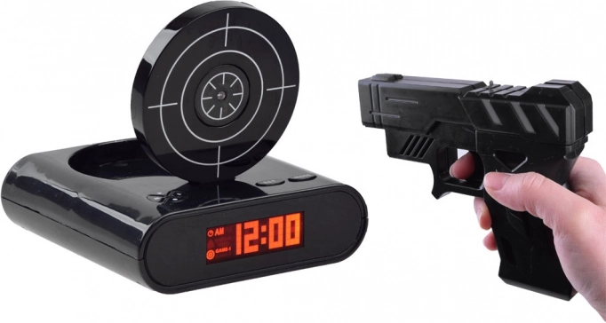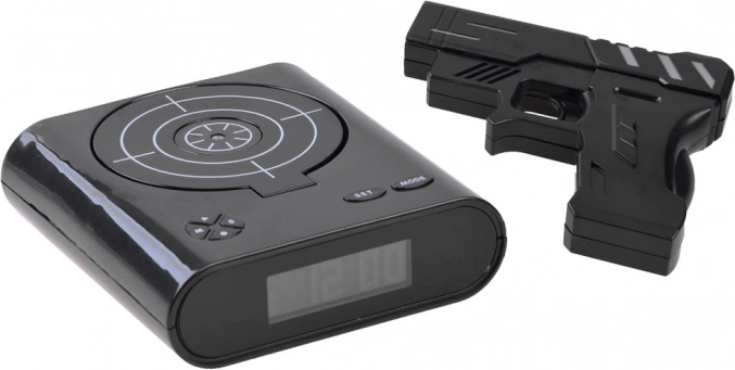 Budík s pistolí a terčem – interaktivní střelecký budík – černá