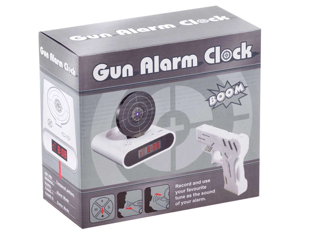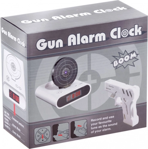 Zpříjemněte si ranní vstávání s originálním řešením: budík s pistolí a terčem. Po zazvonění stačí zamířit a „vystřelit“ na terč, aby se alarm vypnul. Nabízí dva herní režimy, možnost nahrání vlastního alarmu a čitelné LCD. Lze napájet bateriemi AA nebo přes micro USB (kabel není součástí). Skvělá zábava i funkční probuzení v jednom.