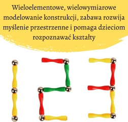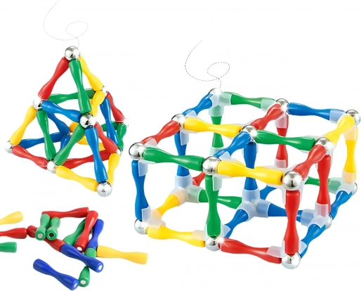 - 38 magnetických tyček (modrá, žlutá, oranžová), 40 kovových kuliček, 50 průhledných stabilizátorů spojů