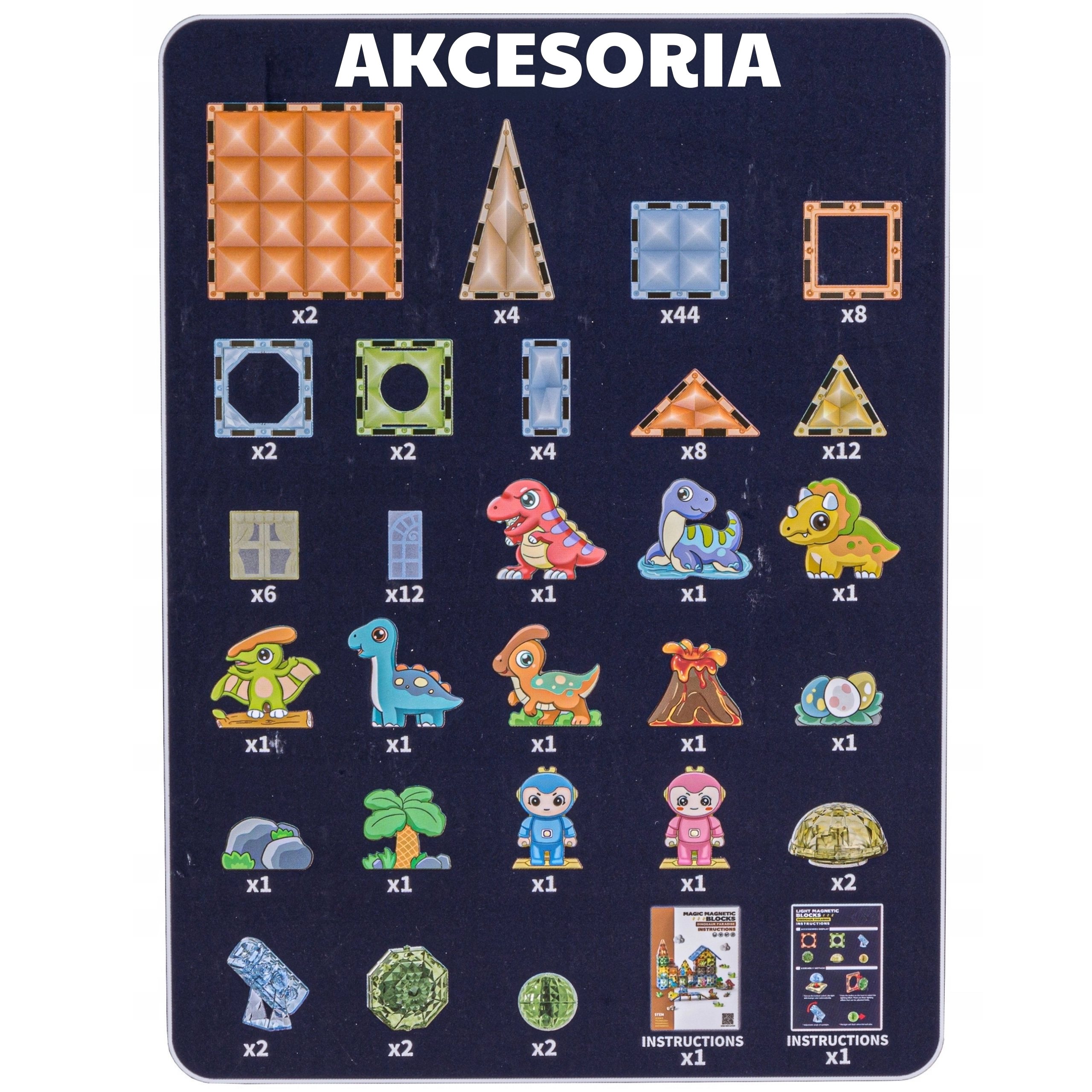 - Magnetické dílky, figurky dinosaurů a postav, tematické prvky, ilustrovaný návod