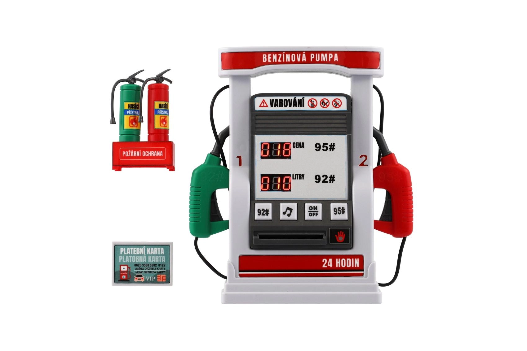 Součástí sady jsou dvě tankovací hadice, platební karta, hasiče přístroje a další doplňky, které vytvářejí realistické prostředí čerpací stanice. Kompaktní balení je ideální pro domácí hraní i na cesty.