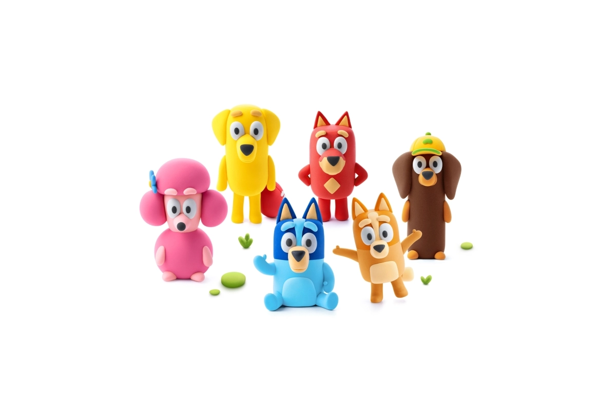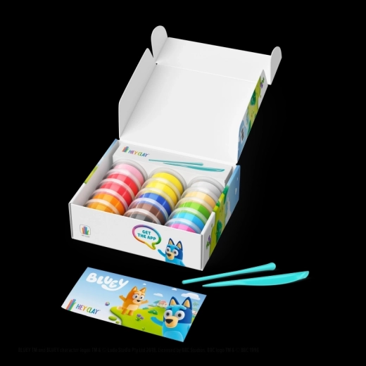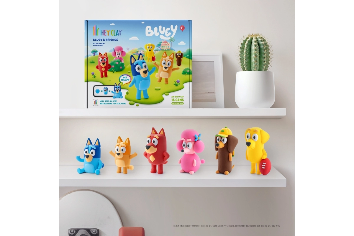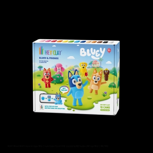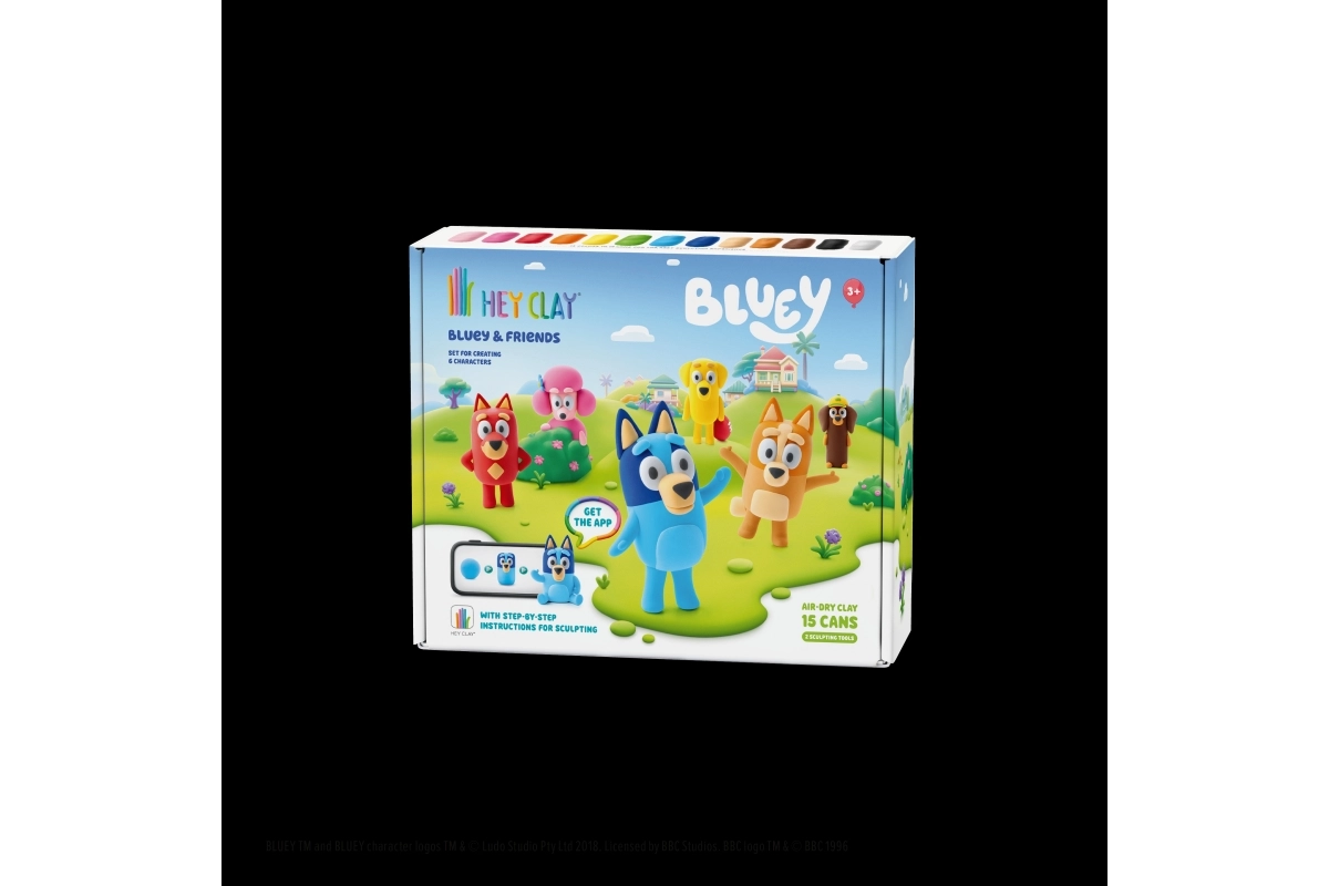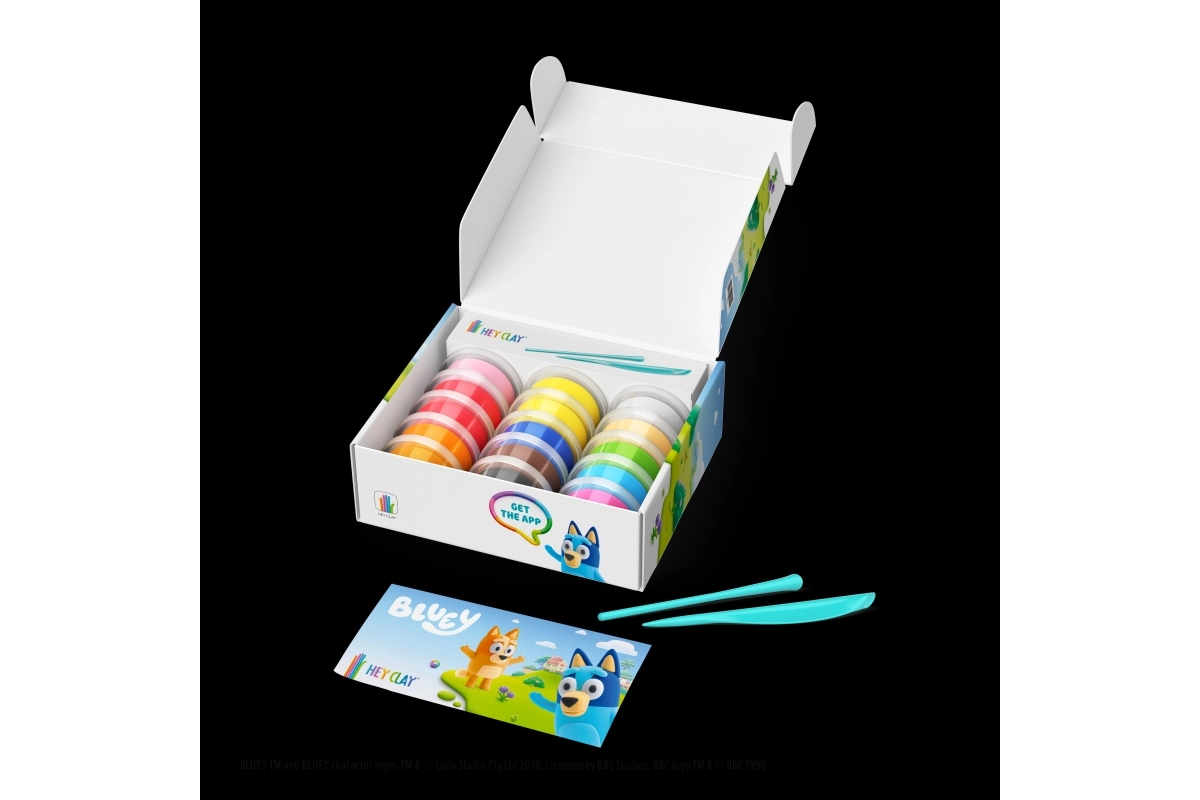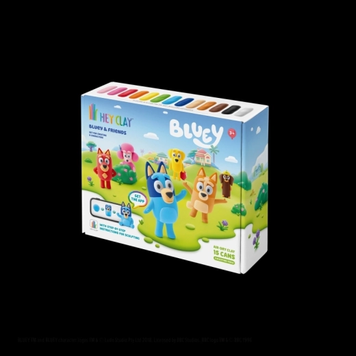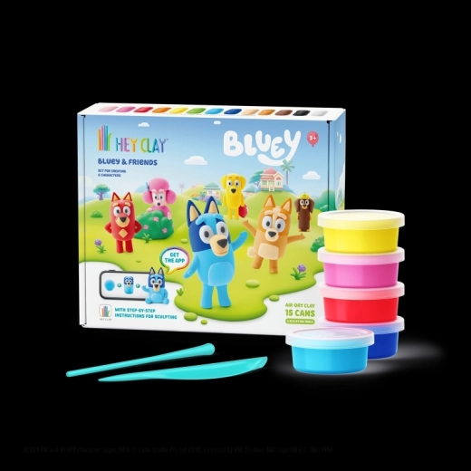 Objevte kreativní svět s modelovací hmotou HEY CLAY a sadou Bluey a přátelé. Vytvořte si celou šestici oblíbených postaviček – Bluey, Bingo, Luckyho, Snickerse, Coco a Rustyho – pomocí barevné, lehké hmoty a interaktivních návodů v aplikaci. Hotové figurky po vyschnutí ztvrdnou a jsou skvělé na hraní i sbírání.