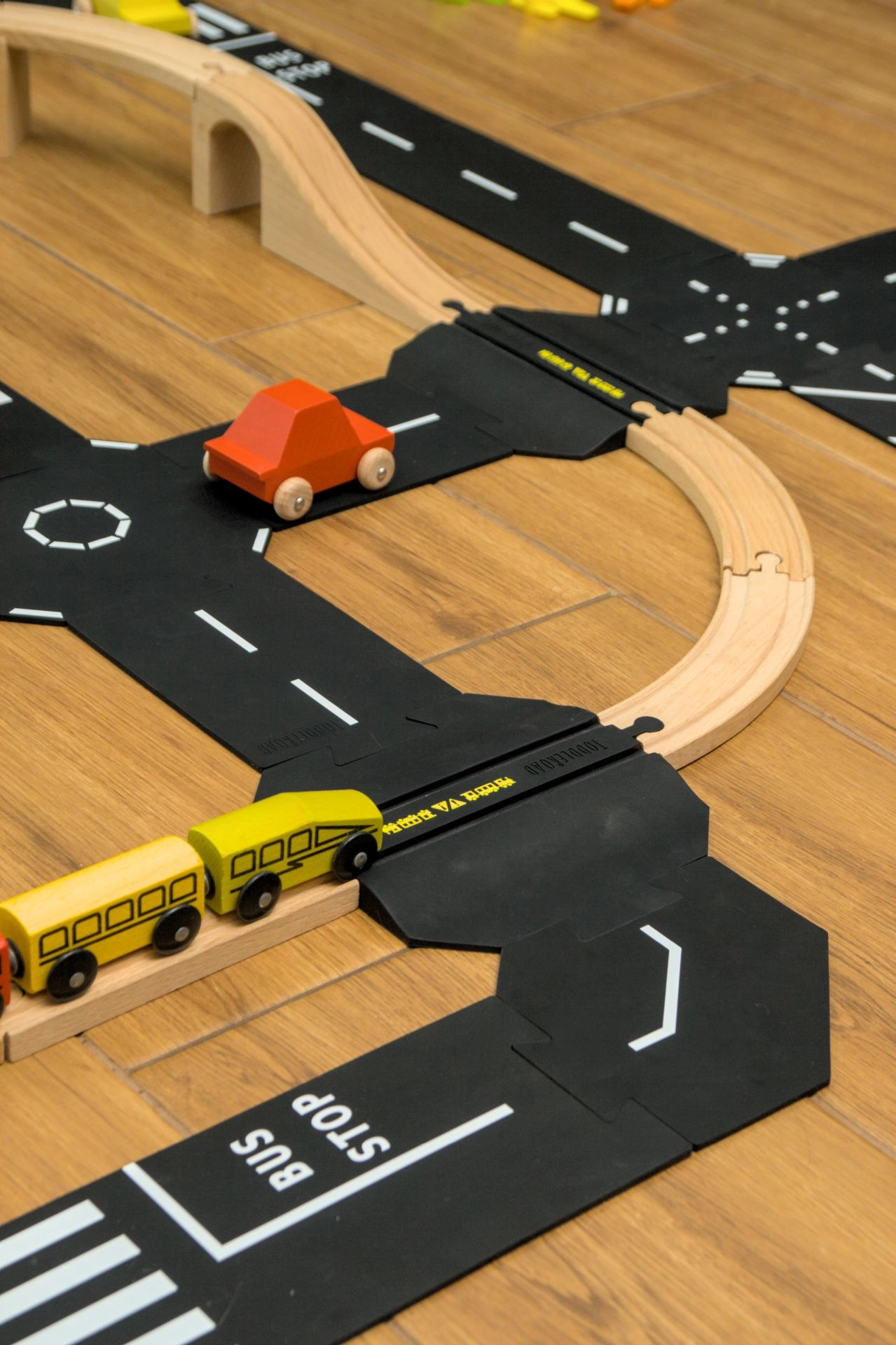 - Propojení silnic a kolejí – plynulý přejezd pro auta přes dřevěné koleje (BRIO, MAXIM).