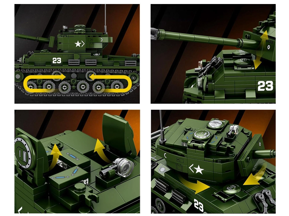 Vdechněte život ikonickému americkému tanku SHERMAN M4A3E8. Tento oficiálně licencovaný set WORLD OF TANKS věrně zachycuje siluetu, věž, kanón i podvozek „Easy Eight“. Díky promyšleným pohyblivým částem a pevné konstrukci je model skvělý pro vystavení i akční scénáře.