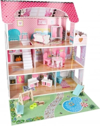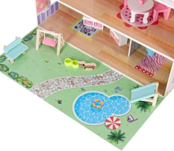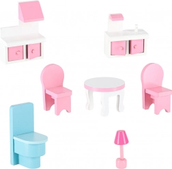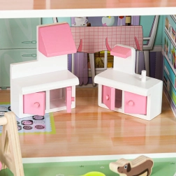 Bohaté příslušenství zahrnuje stůl, 2 židle, houpačku, toaletu, lehátko, lavičku, dětskou postýlku, lampu, misku pro pejska, skříň, sporák a umyvadlo i roztomilou figurku pejska. Díky robustní konstrukci z MDF, plastovým doplňkům a kovovým šroubkům je domek stabilní a odolný vůči každodennímu hraní.
