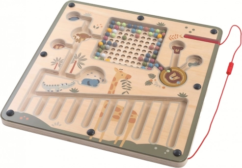 Objevte zábavnou a vzdělávací hračku pro děti od 3 let – magnetickou hrací desku s motivem safari. Díky připojenému magnetickému peru děti přesouvají barevné kuličky v bezpečném labyrintu a trénují tak jemnou motoriku, koordinaci ruka–oko, logické myšlení a třídění podle množství. Průhledný kryt zajistí, že se kuličky nevysypou, a hra je tak bezpečná a bez nepořádku.