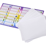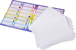 Součástí je připojený stylus/štětec, kompaktní základna pro snadné uložení a sada bílých karet pro opakované trénování kresby podle jednoduchých předloh.