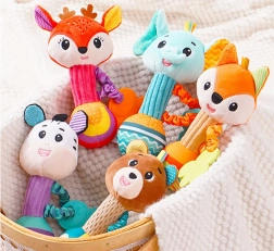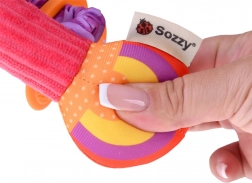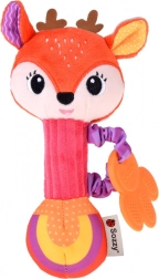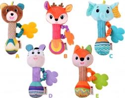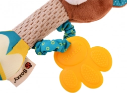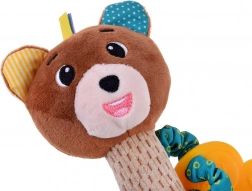 - Interaktivní prvky: chrastítko uvnitř, šustící ouška a pískátko v tělíčku