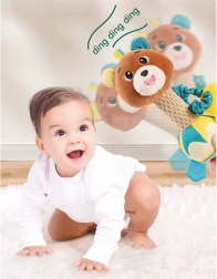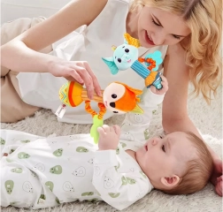 Tato více-senzorická hračka přináší miminku jistotu i zábavu: uvnitř je ukryté chrastítko s příjemným zvukem, ouška z šustivé látky lákají k objevování a po stisku bříška se ozve veselý pískot. Kontrastní barvy a různé textury přirozeně rozvíjejí zrak, sluch i hmat.