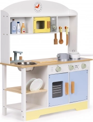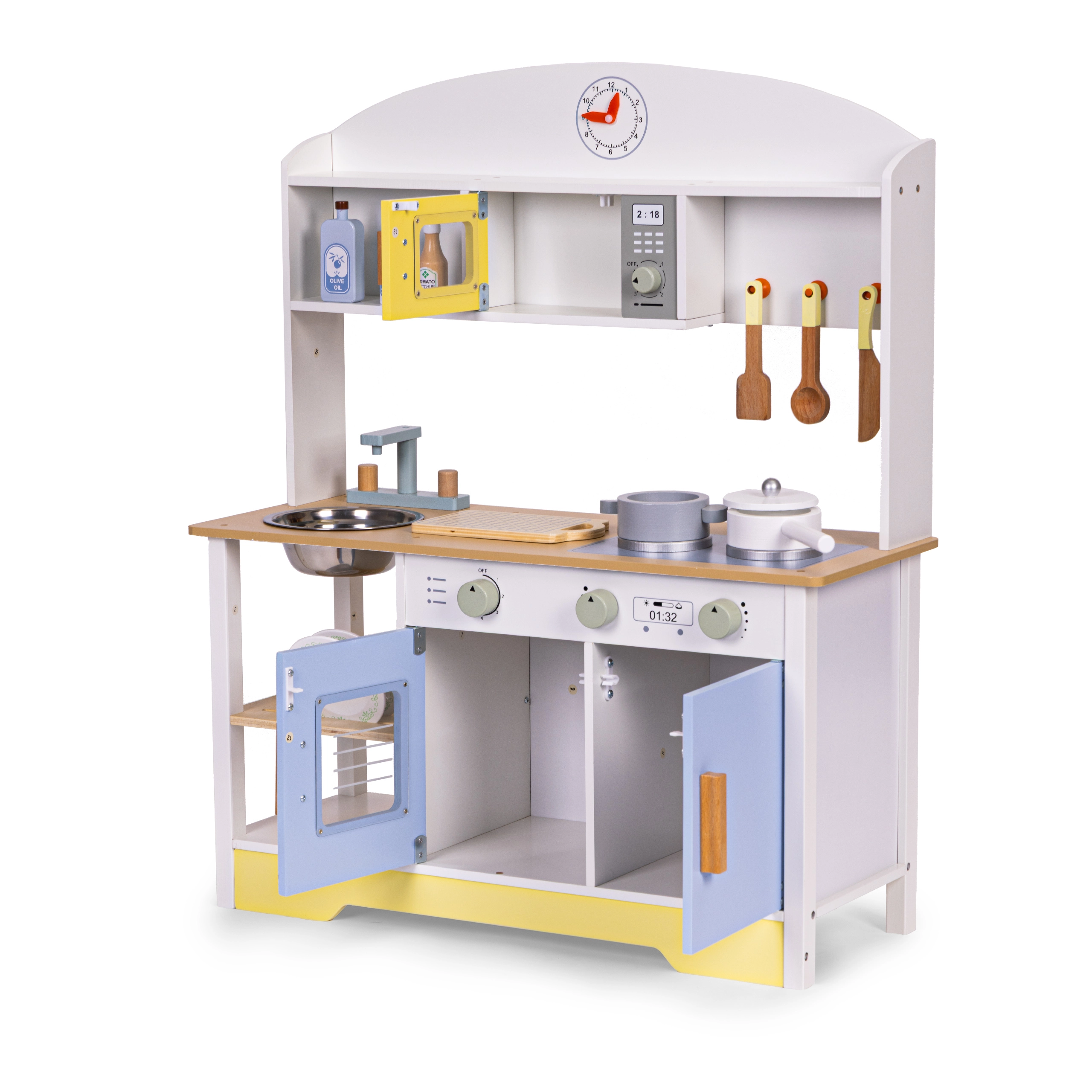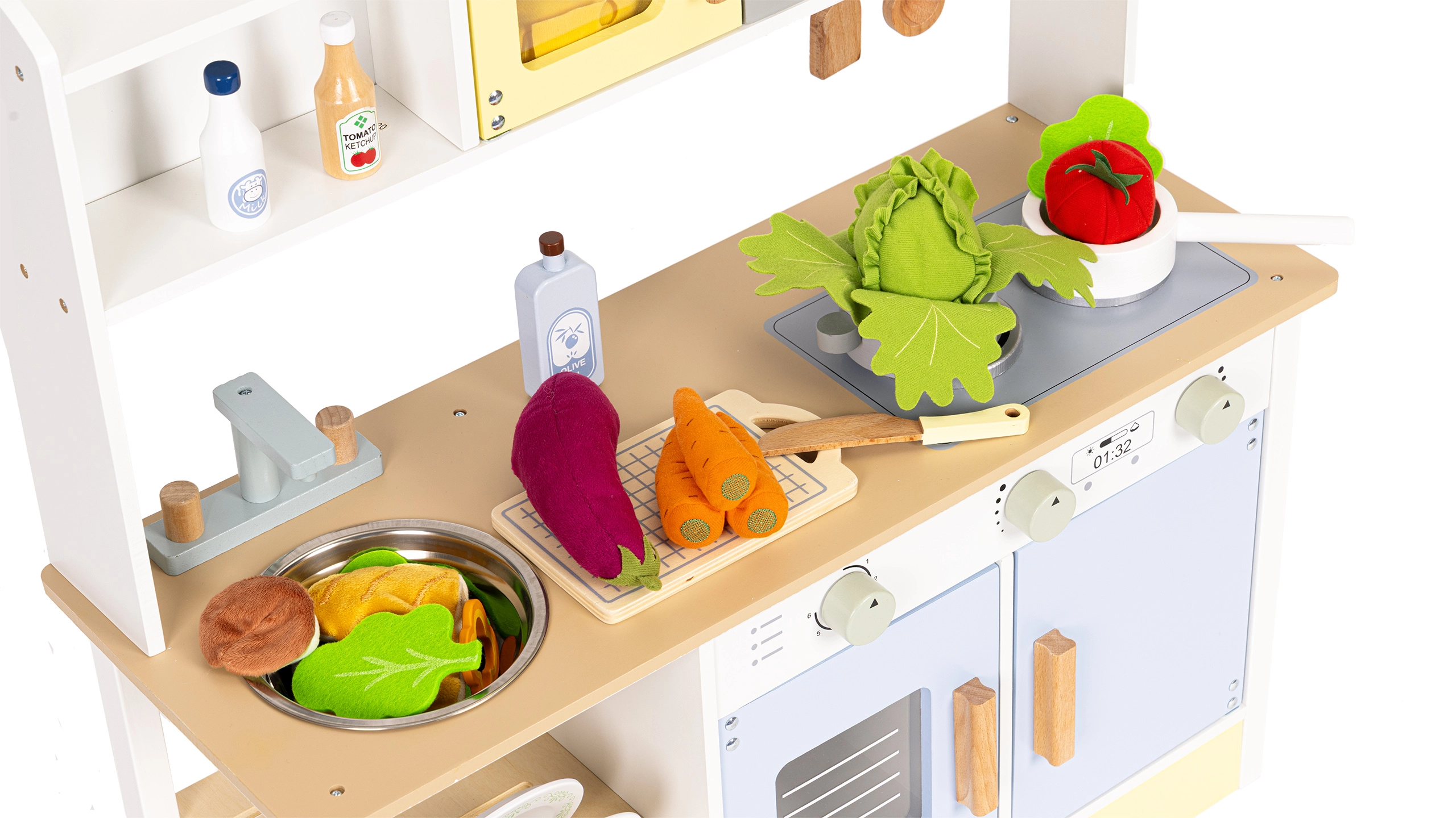 Díky pračce s otočným voličem, praktickým skříňkám a policím a hodinám s pohyblivými ručičkami rozvíjí kuchyňka jemnou motoriku, vnímání času i zodpovědnost. Součástí je 12 dřevěných doplňků – hrnec, pánev s poklicí, talířky, příbory, prkénko a lahvičky „olivový olej“, „kečup“ a „mléko“ – pro okamžité hraní.
