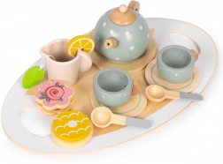 Stylová dřevěná čajová sada s 14 díly je ideální doplněk do dětské kuchyňky, obchůdku či kavárny. Všechny prvky jsou z přírodního dřeva s oblými hranami pro bezpečné hraní, podporují fantazii, spolupráci a rolové hry. Součástí je podnos, čajová konvička, hrnečky, podšálky, lžičky, mléčenka i doplňky jako plátek citronu, čajový sáček a sušenky.
