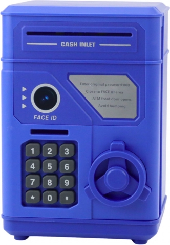 Zábavná a vzdělávací skarbonka v podobě elektronického trezoru učí děti šetřit a nakládat s penězi. Nabízí klávesnici s PIN kódem, automatické vkládání bankovek a bezpečné uložení mincí i hotovosti. Kreativní prvek v podobě samolepky imitující Face ID podněcuje fantazii a dělá z ukládání peněz zábavnou hru.