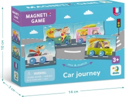 Magnetická hra Dodo Cesta autem je ideální aktivita pro malé průzkumníky, kteří milují auta a zvířátka. Sada obsahuje 8 magnetických prvků s veselými ilustracemi řidičů a cestujících, které děti snadno umístí na jakýkoli kovový povrch. Podporuje jejich kreativitu, rozvoj slovní zásoby a první poznávání světa kolem nás.