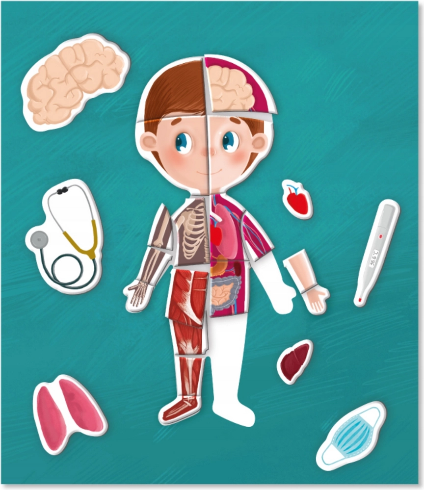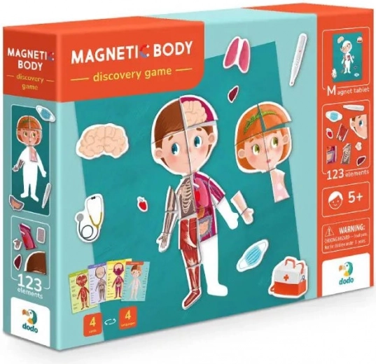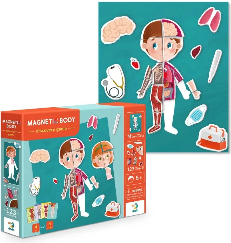 Magnetická hra Dodo Lidské tělo je skvělá pomůcka pro děti od 5 let, které chtějí poznat, jak funguje lidské tělo. Díky rozmanitým magnetickým dílkům si mohou skládat kostru, orgány i svaly a zábavně si osvojit nové poznatky. Praktická magnetická deska zajistí přehledné skládání doma i na cestách.