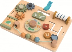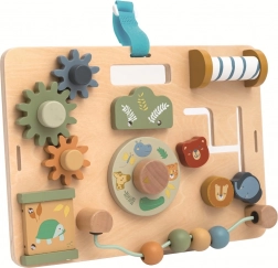 Objevte zábavnou a vzdělávací hračku pro nejmenší: aktivní desku v jemných pastelových barvách se zvířátky ze Safari. Nabízí korálkový labyrint, ozubená kolečka, otáčecí a posuvné destičky a další prvky, které rozvíjejí jemnou motoriku, koordinaci ruka–oko a zvídavost. Díky praktickému výřezu se snadno přenáší a popruh umožní jednoduché zavěšení.