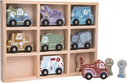 - 8 dřevěných autíček, 3 dopravní značky, polička