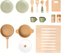 Součástí je bohatá sada příslušenství: talíře, hrnečky, pánev, hrnec s pokličkou, sůl a pepř, prkýnko, kuchyňské náčiní a rošt do trouby. Konstrukce z pevného dřeva a netoxických barev zajišťuje bezpečnost i dlouhou životnost.