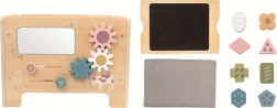Pod sedákem se skrývá praktická kreslicí tabulka pro první obrázky a poznámky. Po stranách pak děti zabaví pestrá škála herních prvků: labyrint se zvířátky pro trénink trpělivosti, vkládací tvary pro poznávání tvarů, ozubená kolečka pro pochopení příčiny a následku, hodiny pro učení času a zrcátko pro hravou sebereflexi.