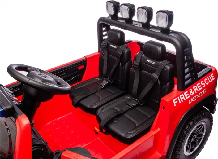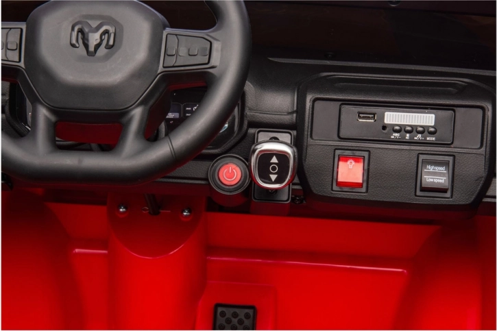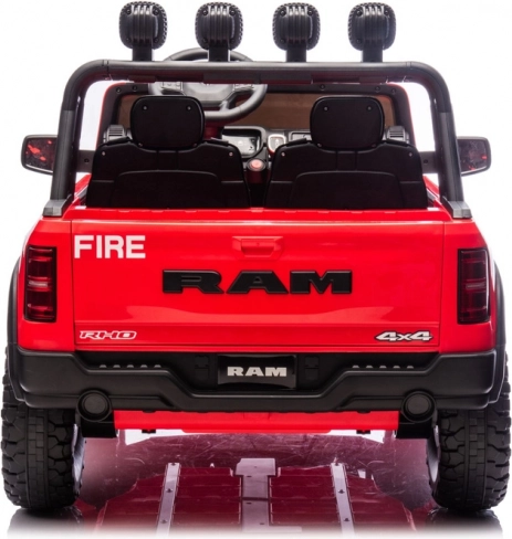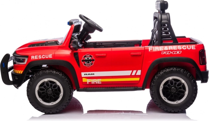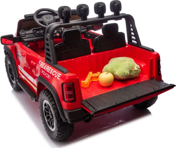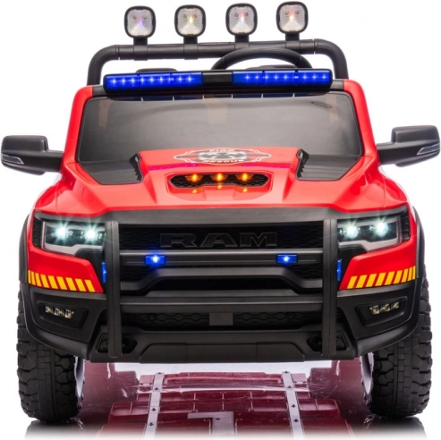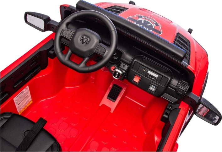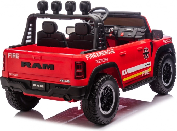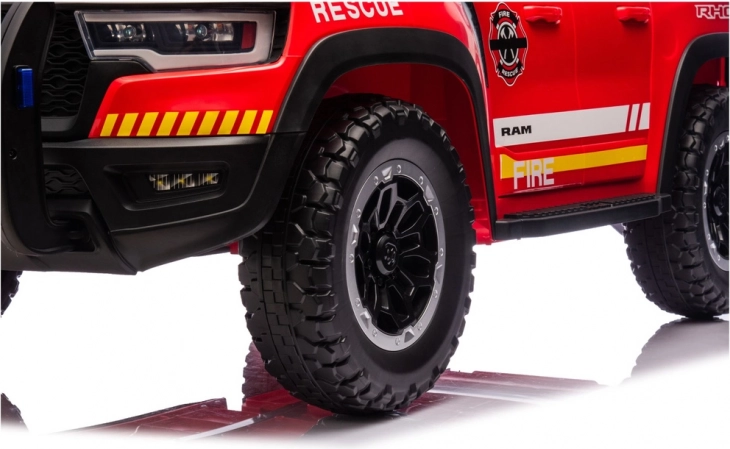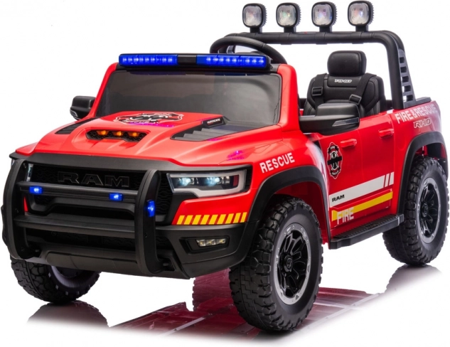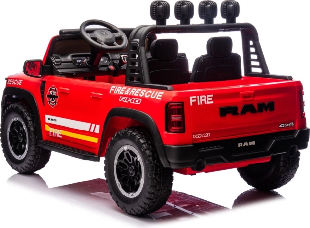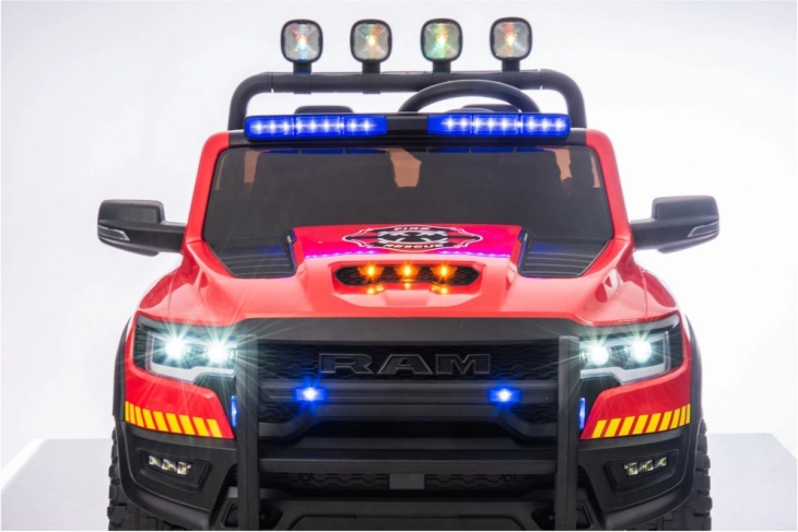 Stylový červený pick‑up ve stylu RAM je ideální pro malé nadšence do hasičů. Dvojmístné provedení s bezpečnostními pásy, realistický kokpit s volantem, pedálem a mediálním panelem i výrazné LED lišty na střeše promění každou vyjížďku v napínavou záchrannou akci. Velká profilovaná kola a ochranný přední rám zajišťují stabilní jízdu a odolný vzhled.