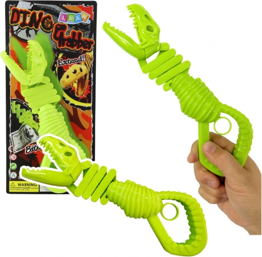 Zábavná a interaktivní hračka pro děti – zelený uchopovač ve tvaru kostry dinosaura. Po stisku rukojeti se čelisti zavřou a bezpečně uchopí předmět, což podporuje jemnou motoriku, koordinaci pohybů a kreativní hru. Vyrobeno z odolného plastu pro dlouhou a bezpečnou zábavu.
