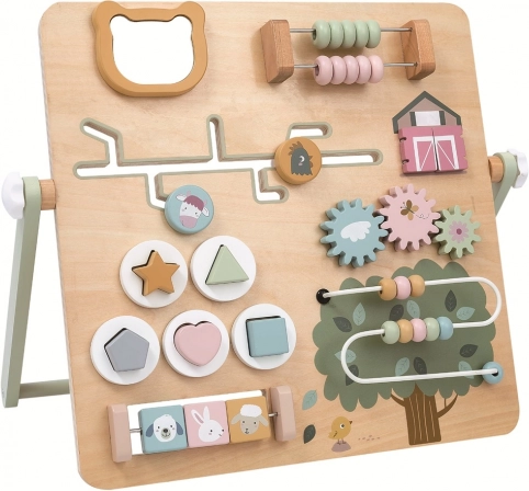 Otočná kolečka, posuvné dráhy, drátěný a korálkový labyrint i počítadlo podporují jemnou motoriku, koordinaci oko–ruka a logické uvažování během hry.