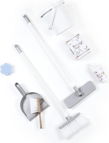 Součástí je lopatka a smetáček, mop, kartáč, kbelík a makety čisticích prostředků – vše pro hraní rolí a rozvoj jemné motoriky.