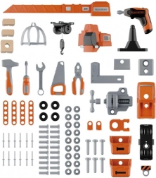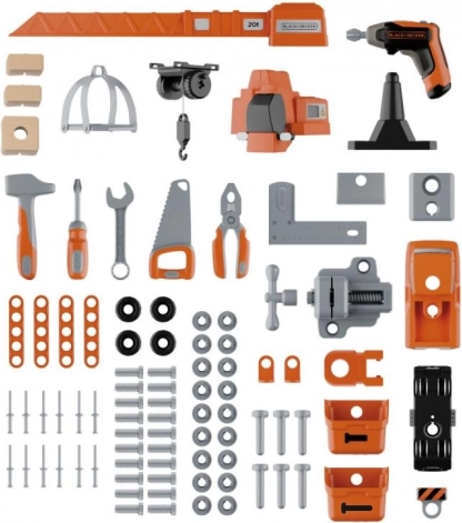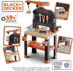 Součástí je stavebnice auta, kterou malí mechanici snadno sestaví v několika krocích. Dílna obsahuje kladívko, klíč na kola, šroubovák, plochý/vidlicový klíč, kleště, pilu, velkou svorku a posuvné pravítko, dále šrouby, matice, hřebíky a spojovací materiál. Kompatibilní a rozšiřitelná se všemi nástroji BLACK+DECKER od značky Smoby.