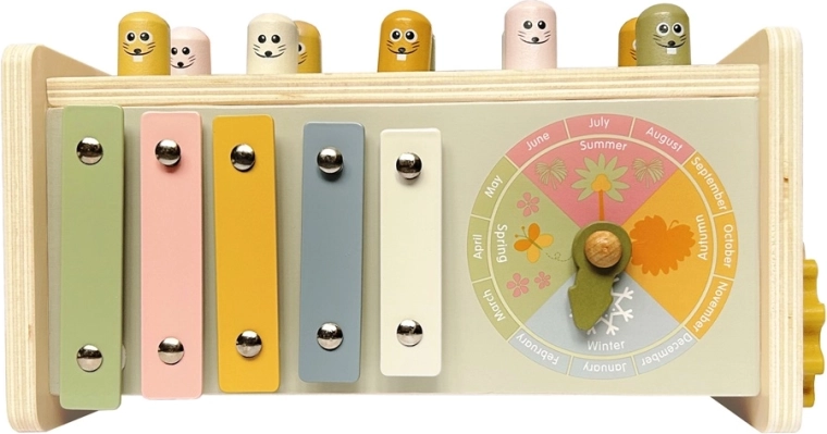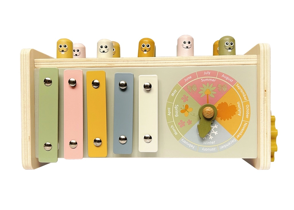 Veselé postavičky a dřevěné kladívko motivují děti k procvičování koordinace, síly úderu a rytmu. Odolná konstrukce zvládne každodenní hraní.