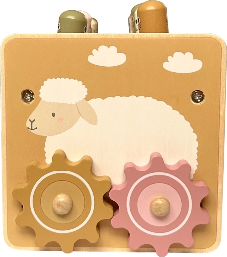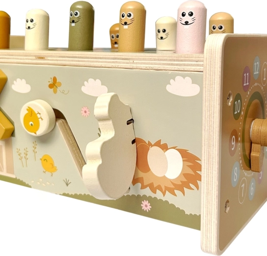 Tato bohatě vybavená dřevěná multifunkční hračka zaujme děti pestrými možnostmi hry a zároveň je nenápadně vede k rozvoji důležitých dovedností. Děti mohou zatloukat veselé krtky dřevěným kladívkem, lovit magnetické rybičky, otáčet ozubenými kolečky, zkoušet ručičky hodin a objevovat další mechanické prvky, které podporují pochopení příčiny a následku.