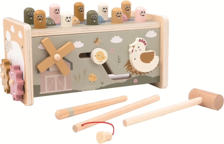 Tato kvalitní dřevěná hračka s motivy z farmy přináší dětem pestrou paletu aktivit na jednom místě. V balení najdete veselou zatloukačku s „krtky“ a dřevěné kladívko pro trénink síly úderu a přesnosti, magnetickou udici pro chytání barevných rybiček a barevný xylofon s paličkou pro rozvoj hudebního sluchu a rytmu (xylofon je pouze hračka).