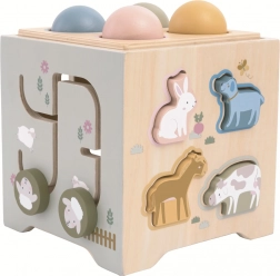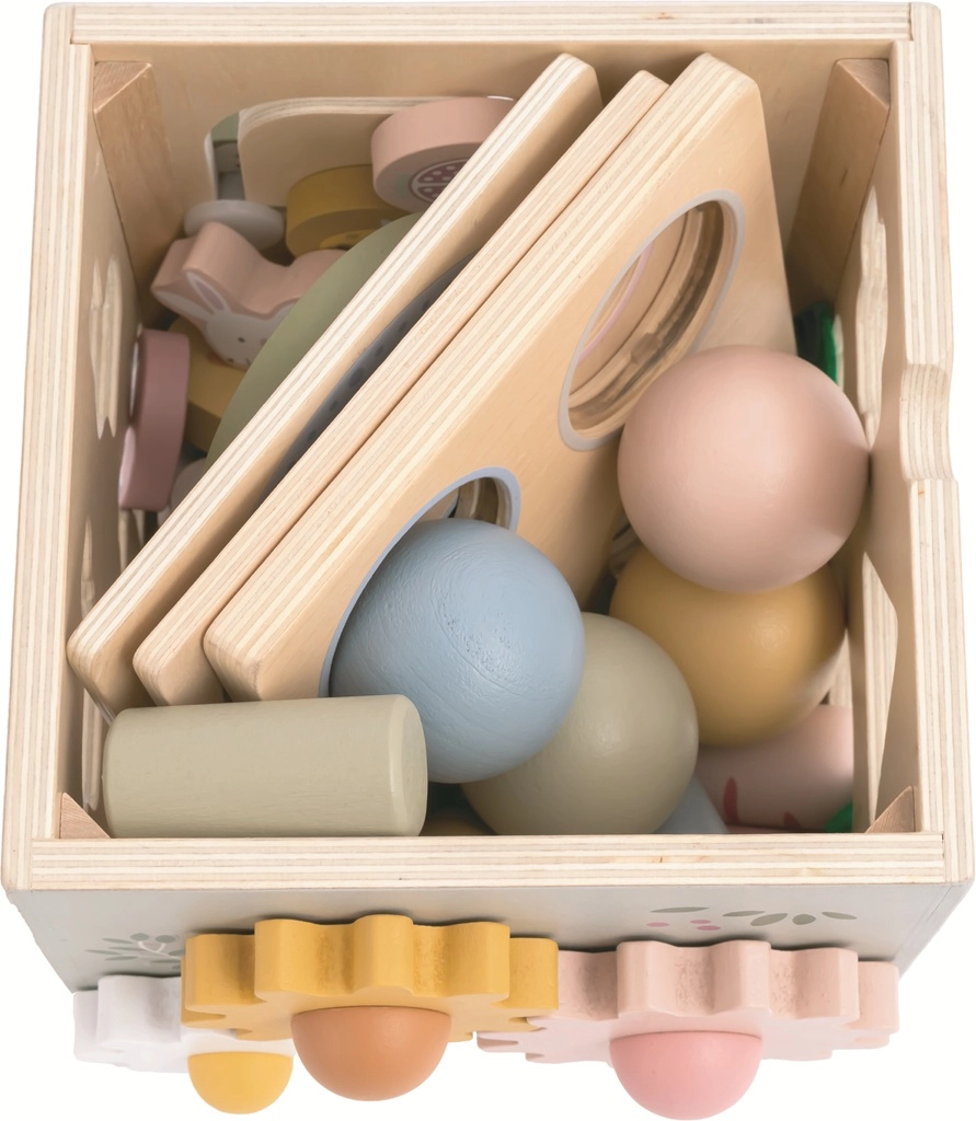 Tato kvalitní dřevěná motorická kostka s jemnými pastelovými barvami a roztomilými ilustracemi zvířátek podněcuje přirozenou zvídavost dětí. Díky 5 herním stranám a vyměnitelným víkům poskytuje spoustu způsobů, jak se učit a bavit – od třídění tvarů a zvířátek, přes skládání a otáčení, až po první počítání. Po hraní jednoduše uložíte všechny díly dovnitř, takže máte doma pořádek.