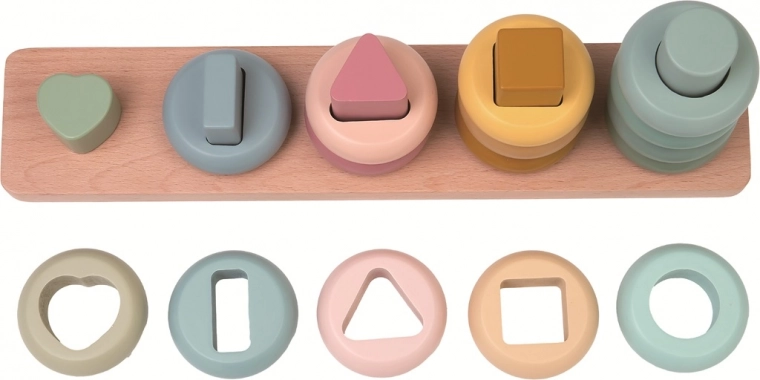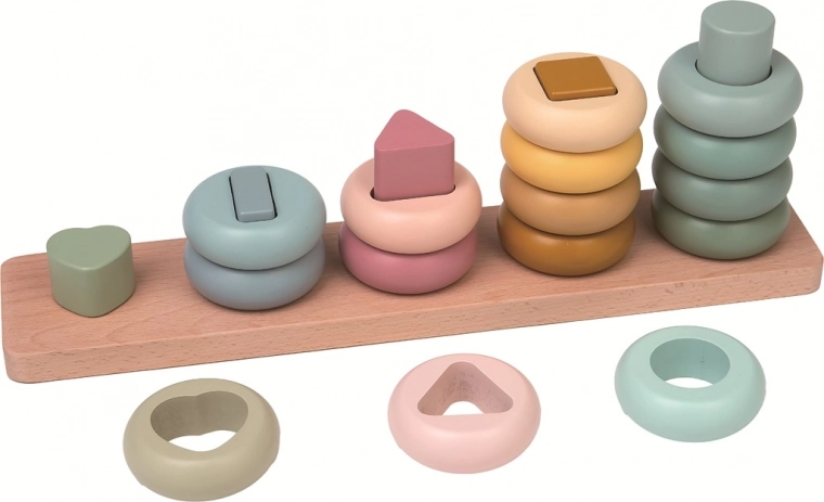 Kvalitní přírodní dřevo se zaoblenými hranami a hladkým povrchem zajišťuje bezpečnou hru, zatímco pastelové a zemité odstíny podněcují vnímání barev bez zbytečné stimulace. Různý počet dílků na sloupcích navíc podporuje učení počtů a srovnávání velikostí.