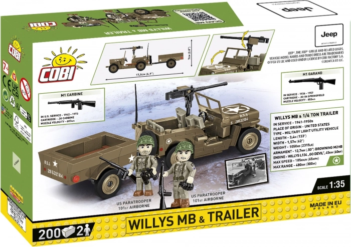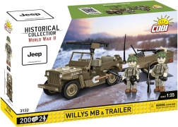 Legendární terénní automobil z druhé světové války ožívá ve stavebnici COBI: Jeep WILLYS MB s přívěsem. Model vyniká autentickými tvary, vojenským zbarvením a sadou doplňků včetně otočného kulometu, nářadí a zbraní pro figurky. Díky kvalitním kostkám je model stabilní a vhodný pro intenzivní hraní i vystavení do vitríny.